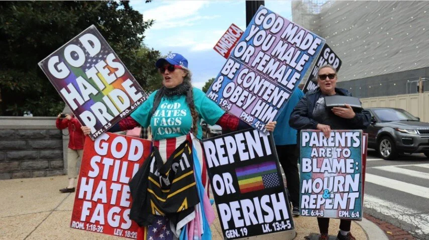 The image below is the Westboro Baptist Church of Topeka, Kansas, USA - a group who infamously pickets around the funerals of dead soldiers and AIDS victims with signs that say “DEATH PENALTY 4 FAGS,” “SAME-SEX MARRIAGE DOOMS NATIONS,” etc.