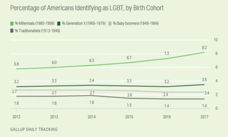 According to a 2017 Gallup poll, American millennials are increasing the rates at which they identify as LGBT, nearly doubling from 5.8% in 2012 to 8.2 in 2017. Oddly, in that same time period, there has been a slight decrease in LGBT identification from Baby Boomers and Traditionalists.